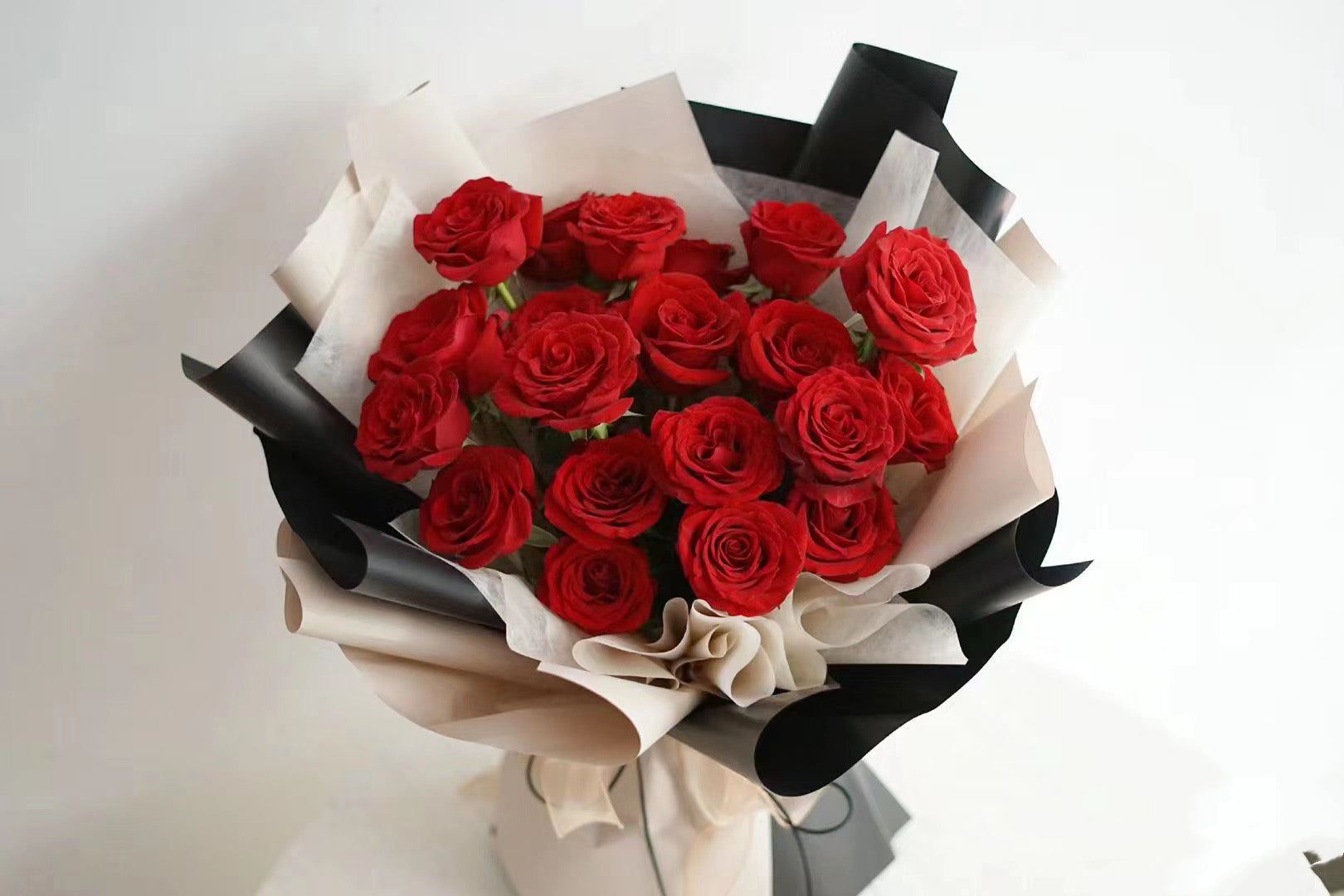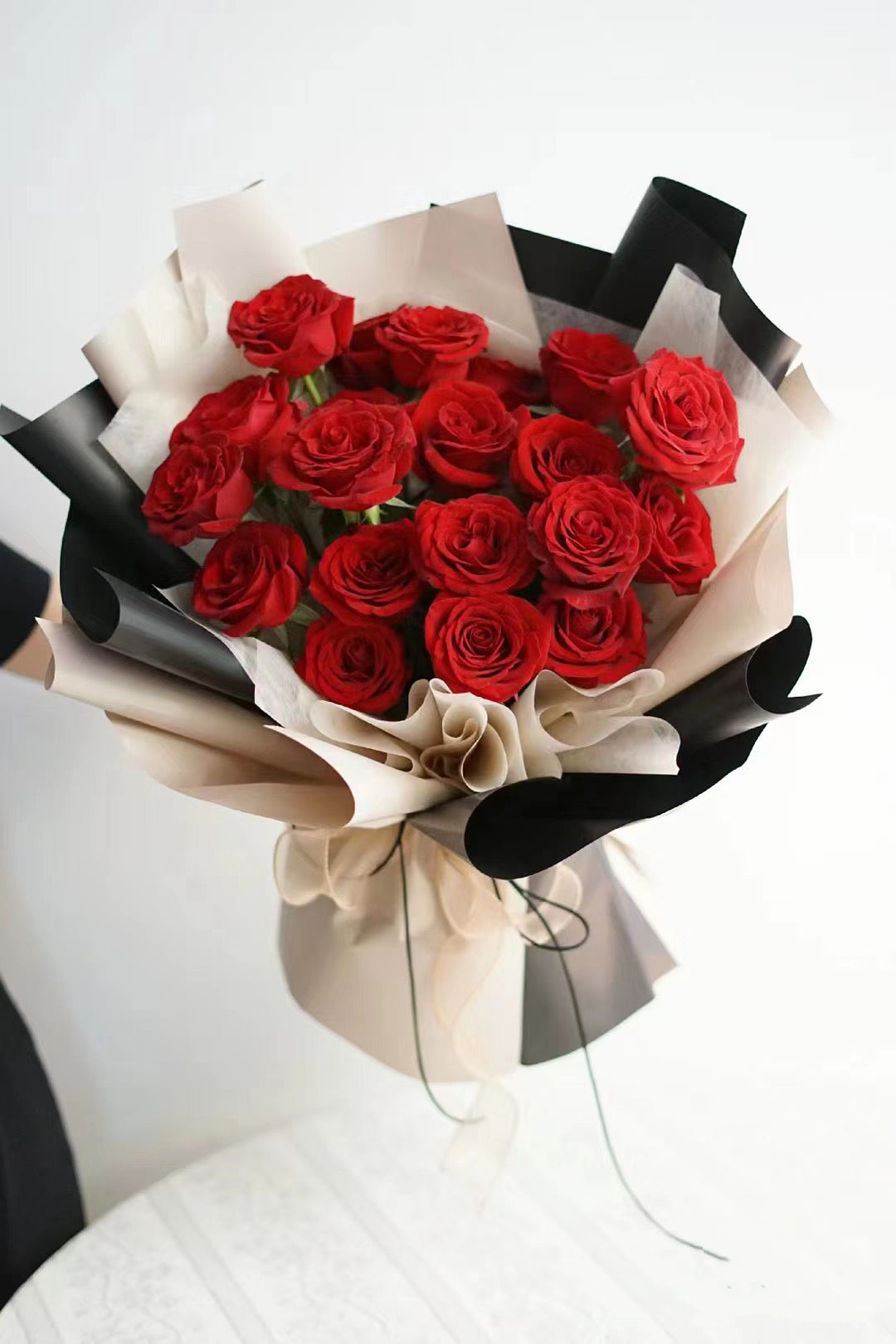 19-20 stems red roses wrap with Earth tone and black waterproof floral paper.